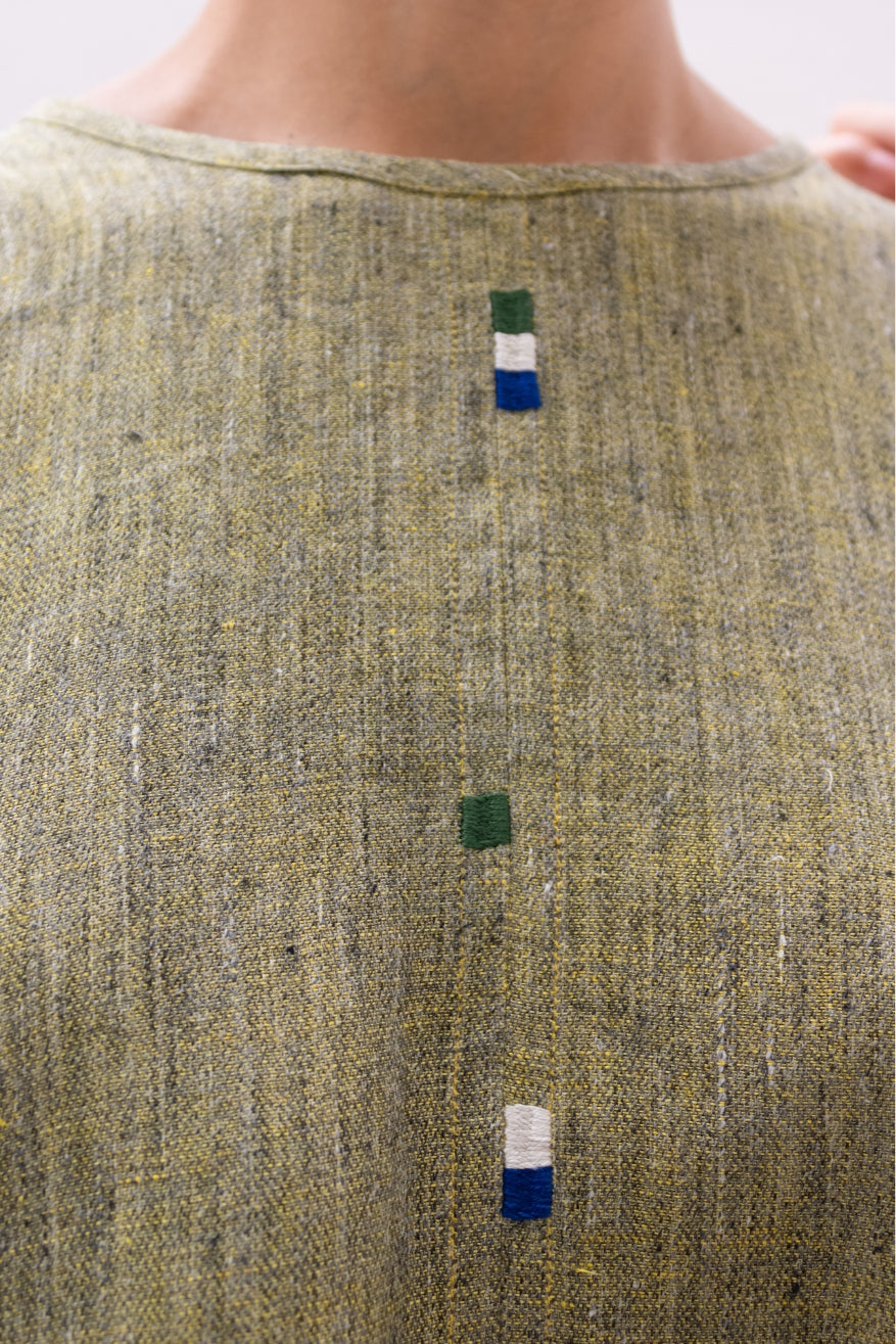 Blusa cuadro, caja de cuello redonda, abertura en espalda, alforzas en hombros y aberturas en los laterales.