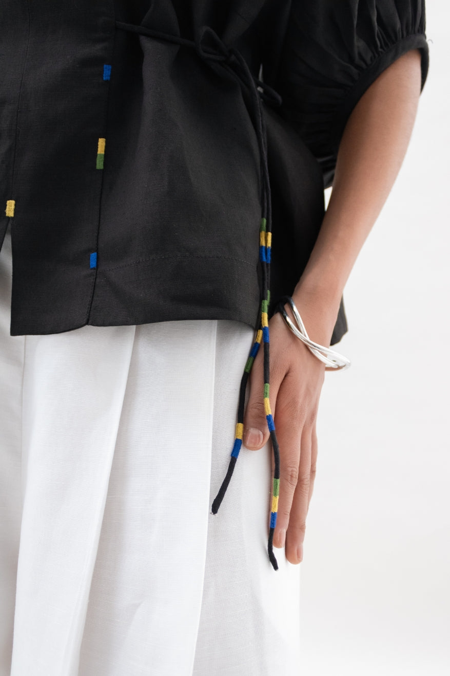 Blusa largo cadera con solapa, abertura en el frente, mangas amplias largo 3/4 y cordones para hacer silueta.