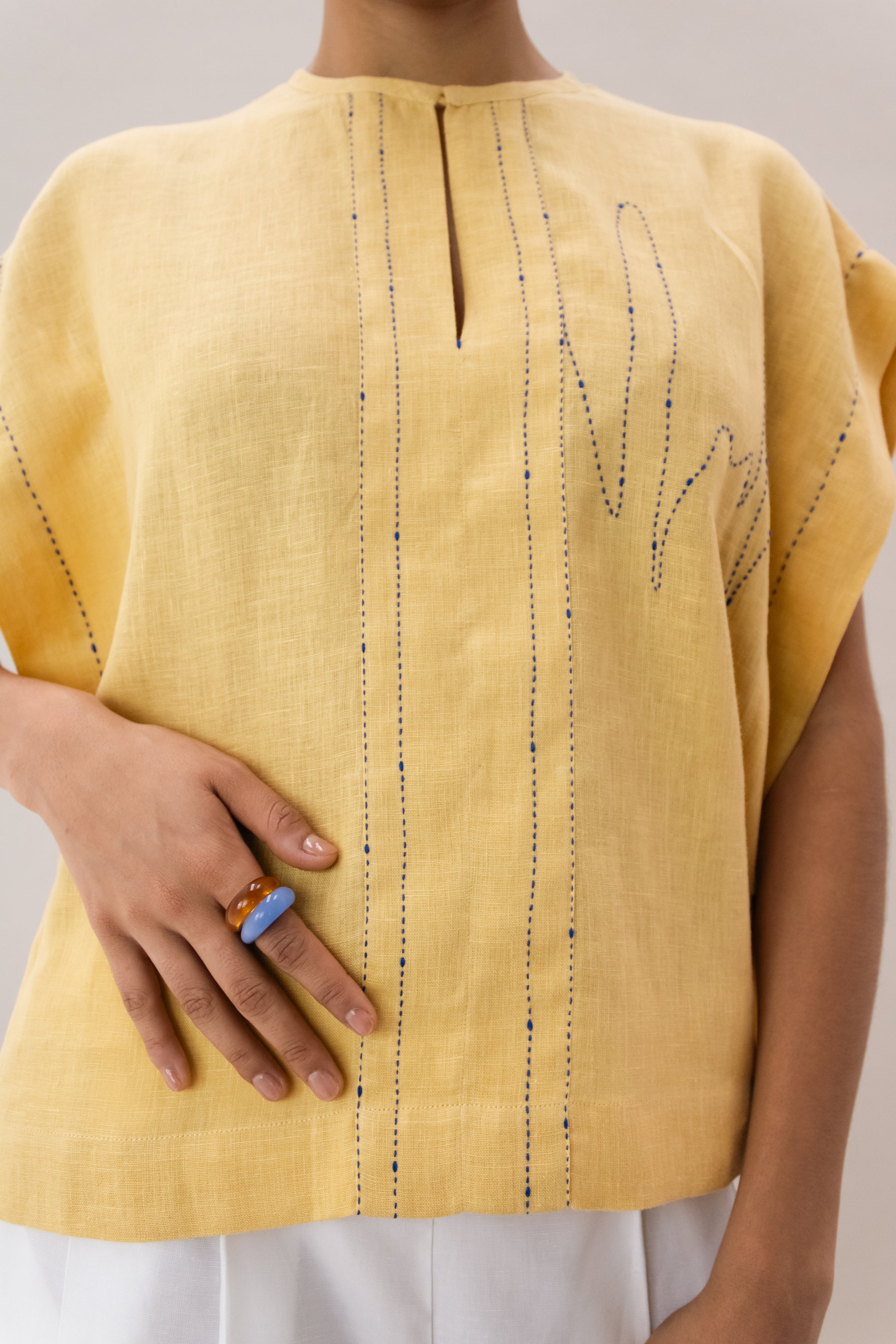 Blusa cuadro con caja de cuello redonda, abertura en el frente, costadillos internos