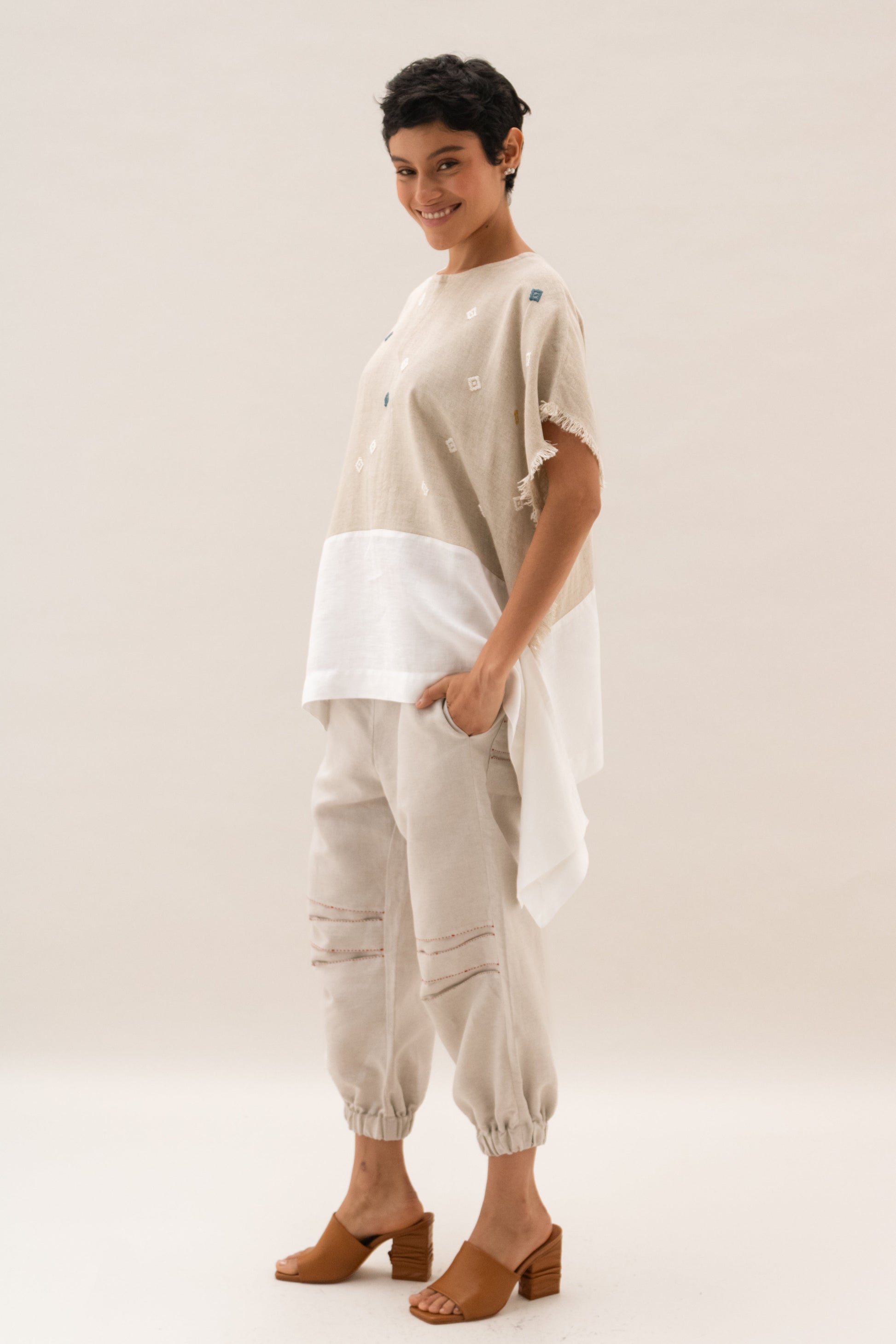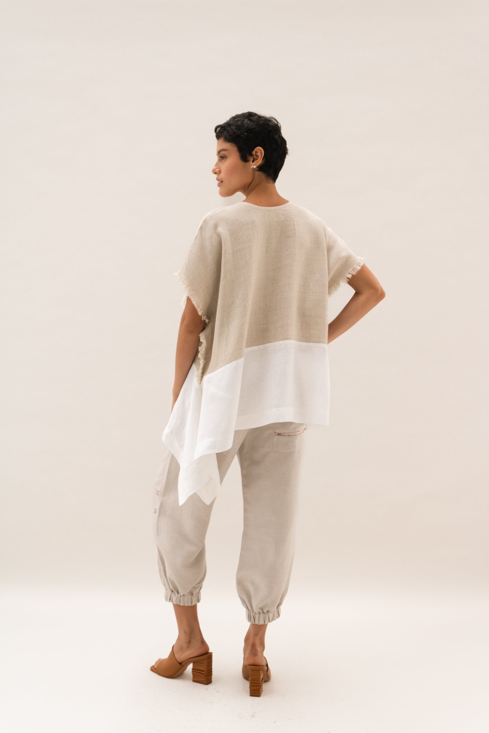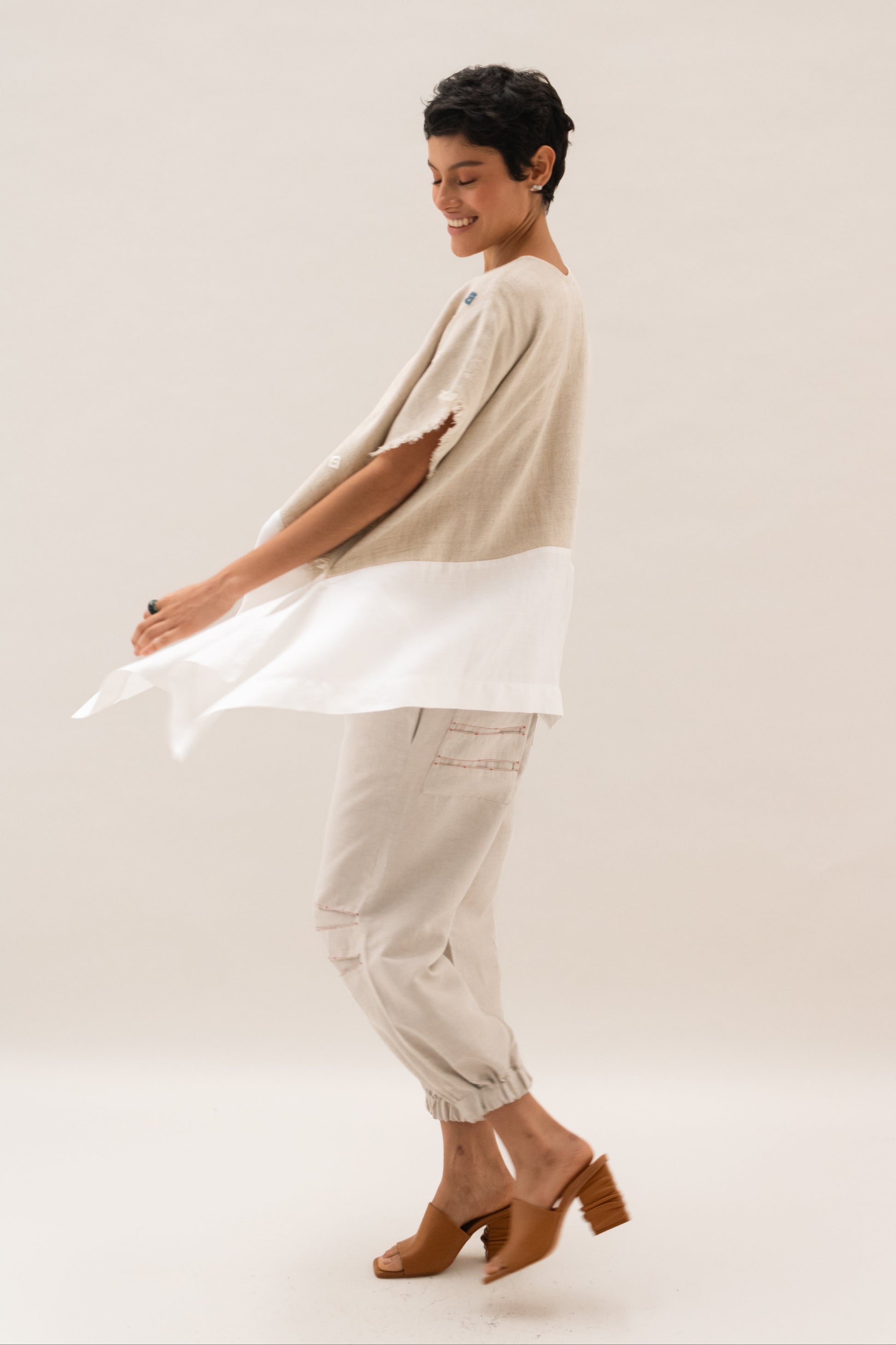 Blusa cuadro con diseño asimétrico, abertura al frente y en los laterales, detalles deshilados.