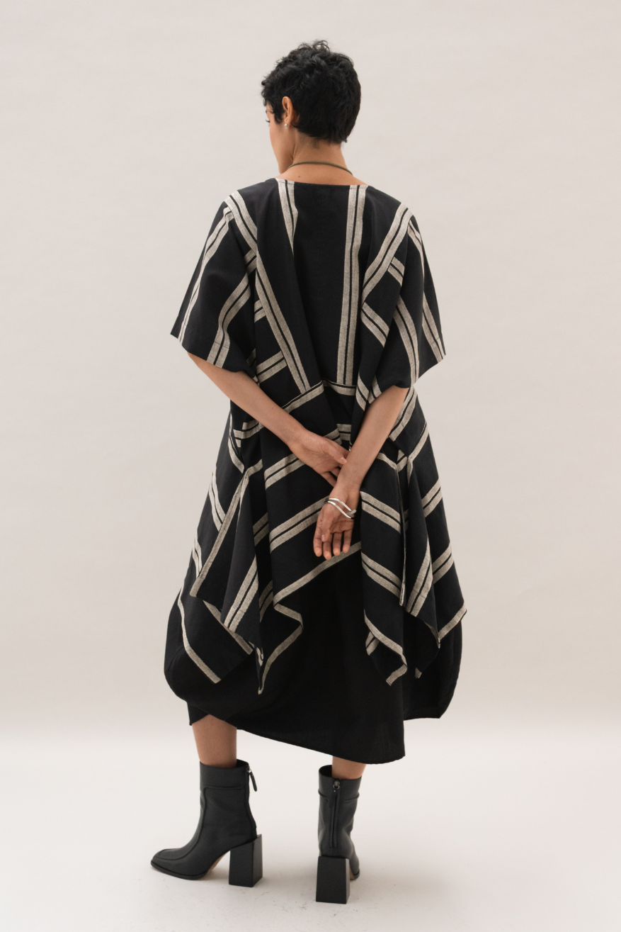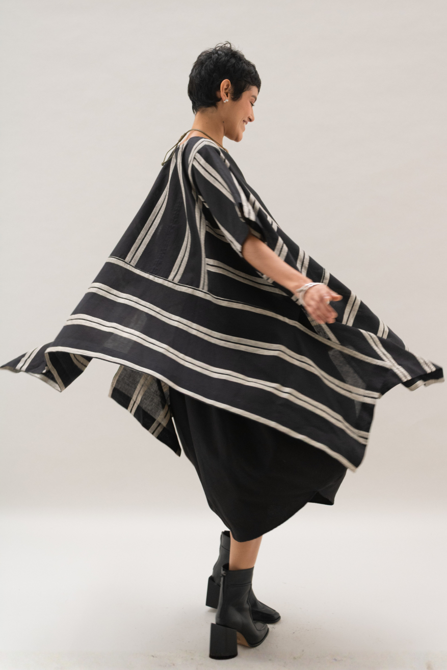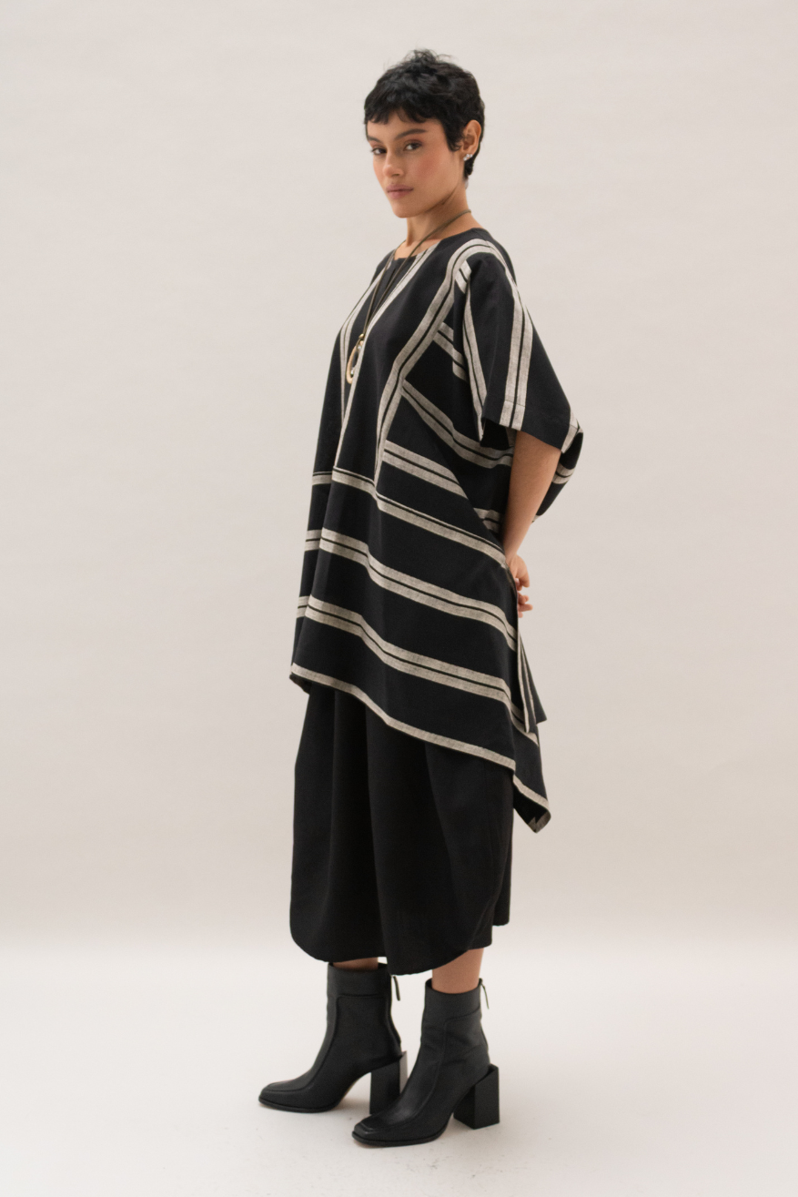Blusa amplia tipo huipil, caja de cuello redonda con abertura al frente y tira montada en la parte baja con caída irregular.