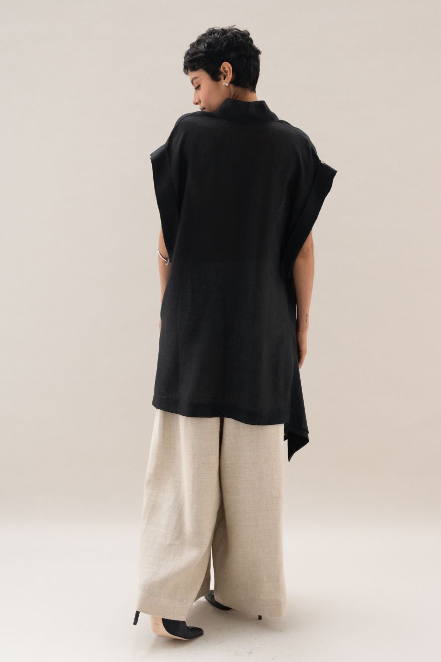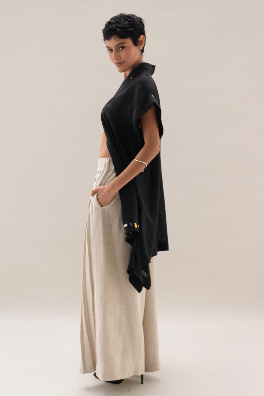 Ensamble largo con solapa, tiras montadas simulando mangas y aberturas laterales con caída irregular.
