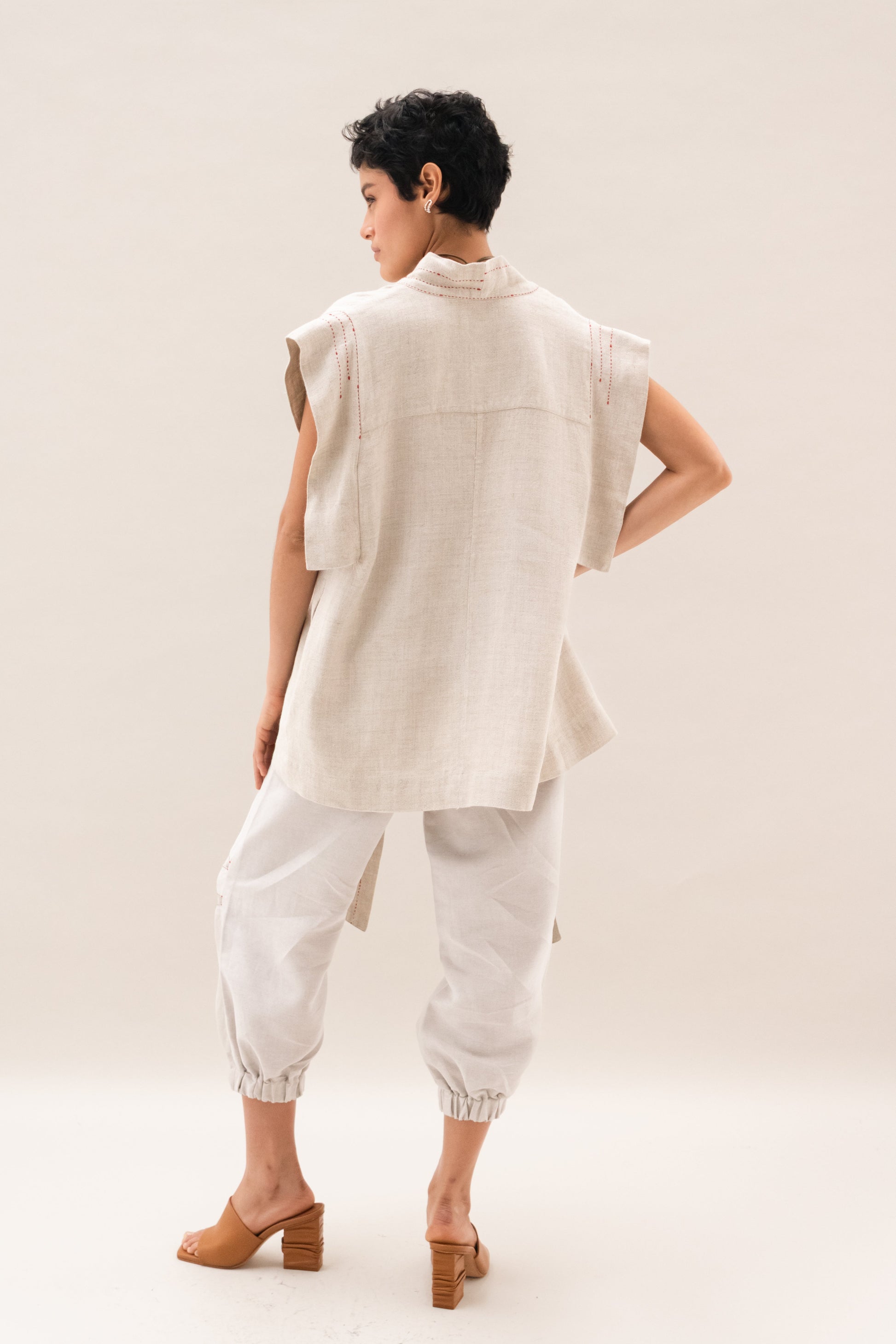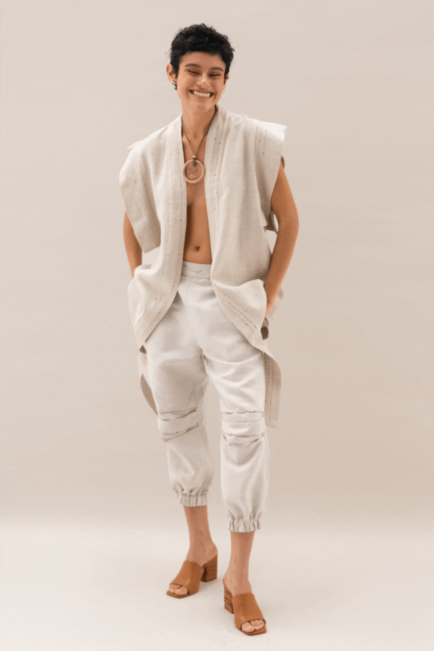 Ensamble largo cadera con solapa, tiras montadas simulando mangas en hombros y bolsillos ocultos.