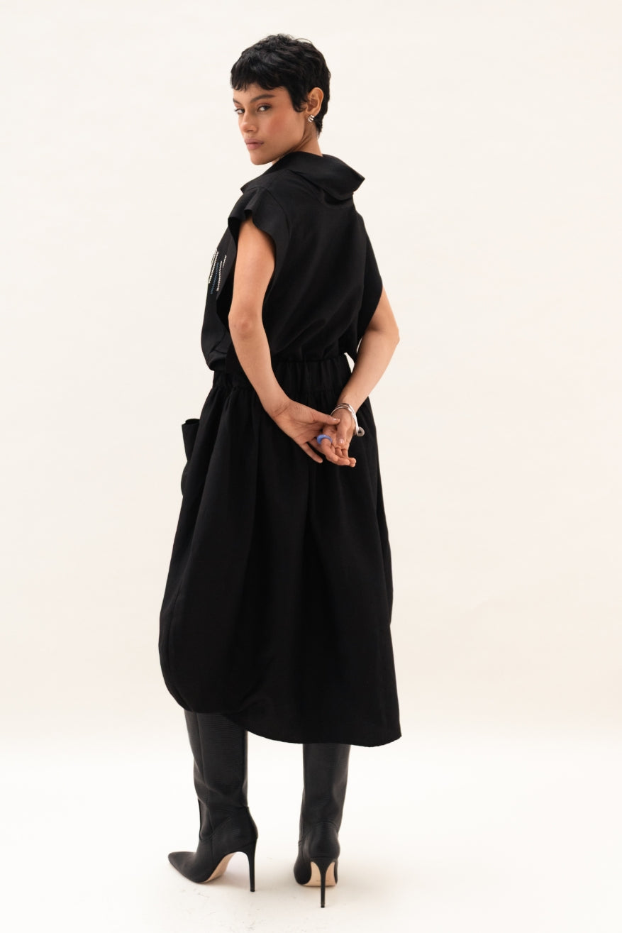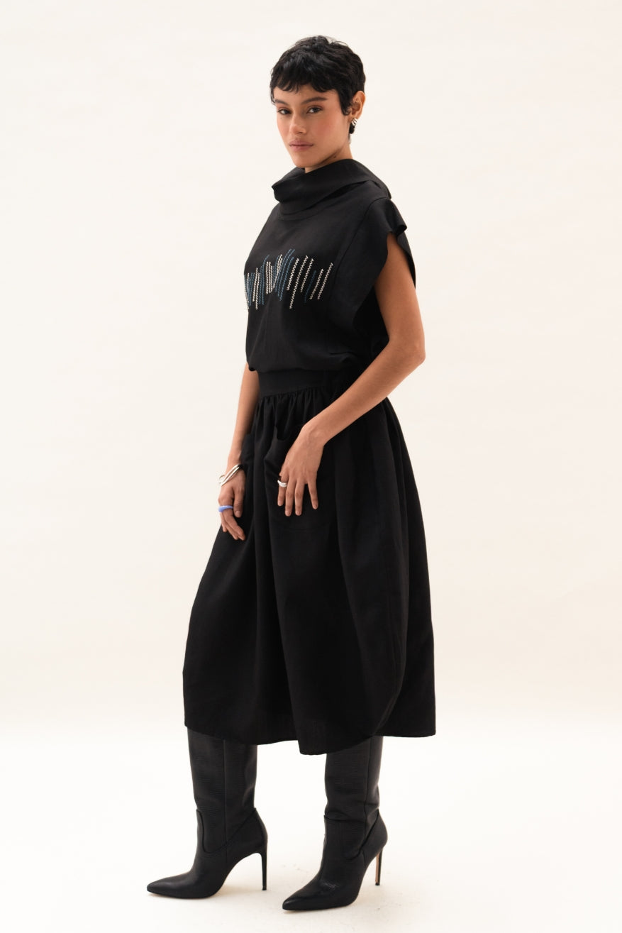 Falda amplia con diseño bajo curvo, largo 3/4, pretina lisa al frente y elastico en la parte trasera, bolsillos de parche y ocultos en los laterales.
