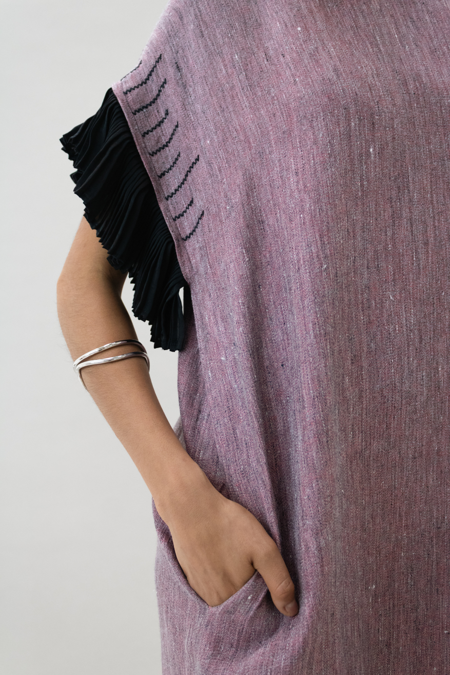 Vestido largo recto, caja de cuello redondo con abertura en la espalda, plisado en mangas, y aberturas al frente.