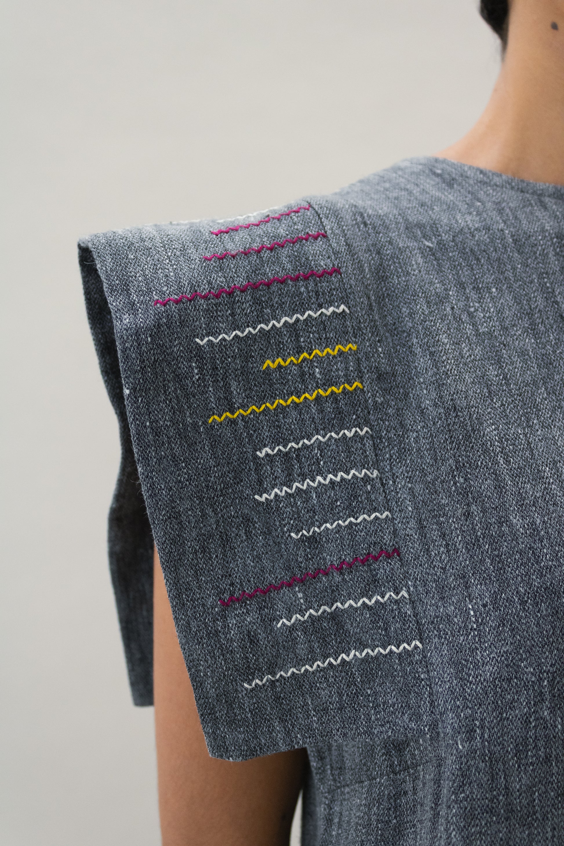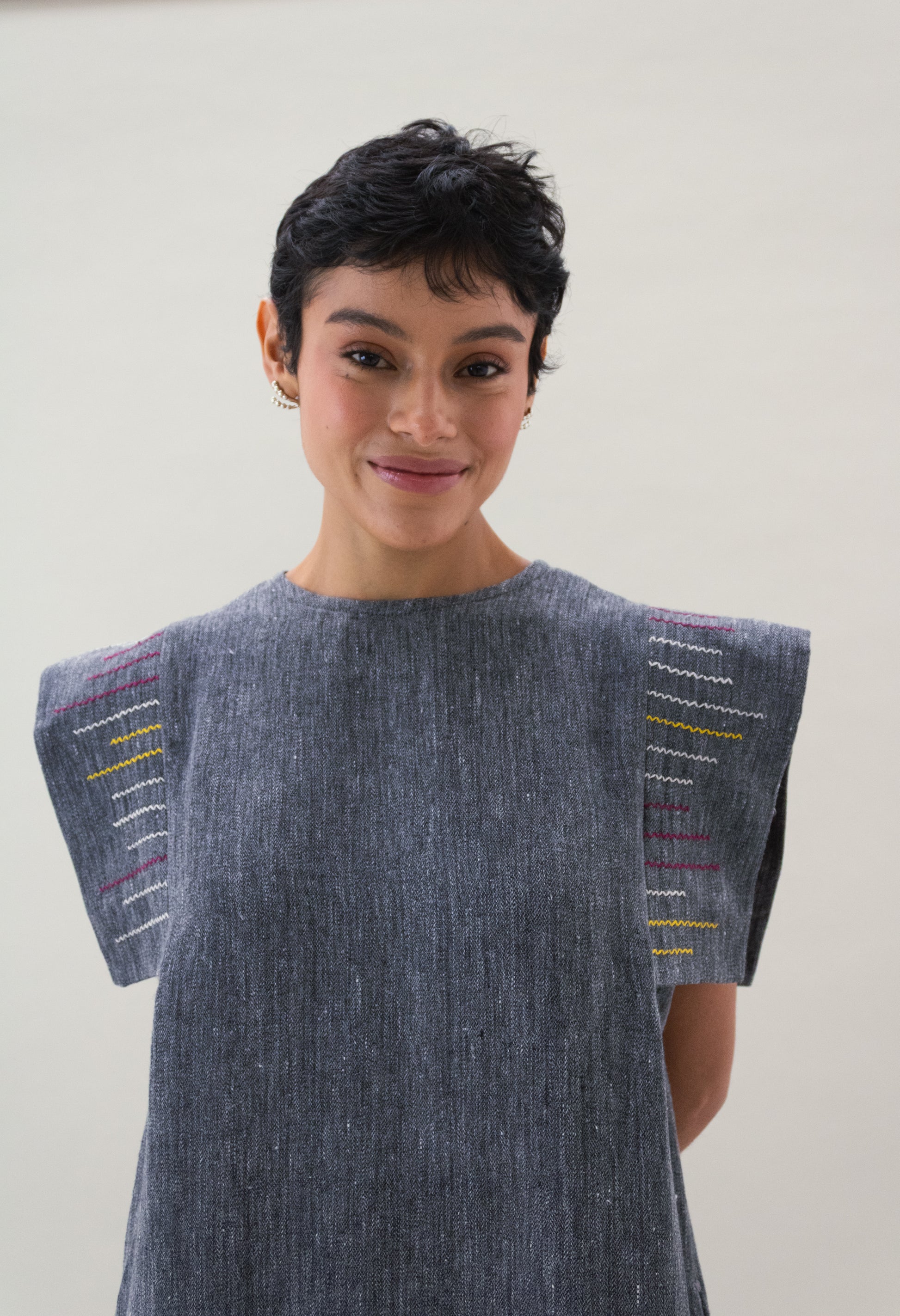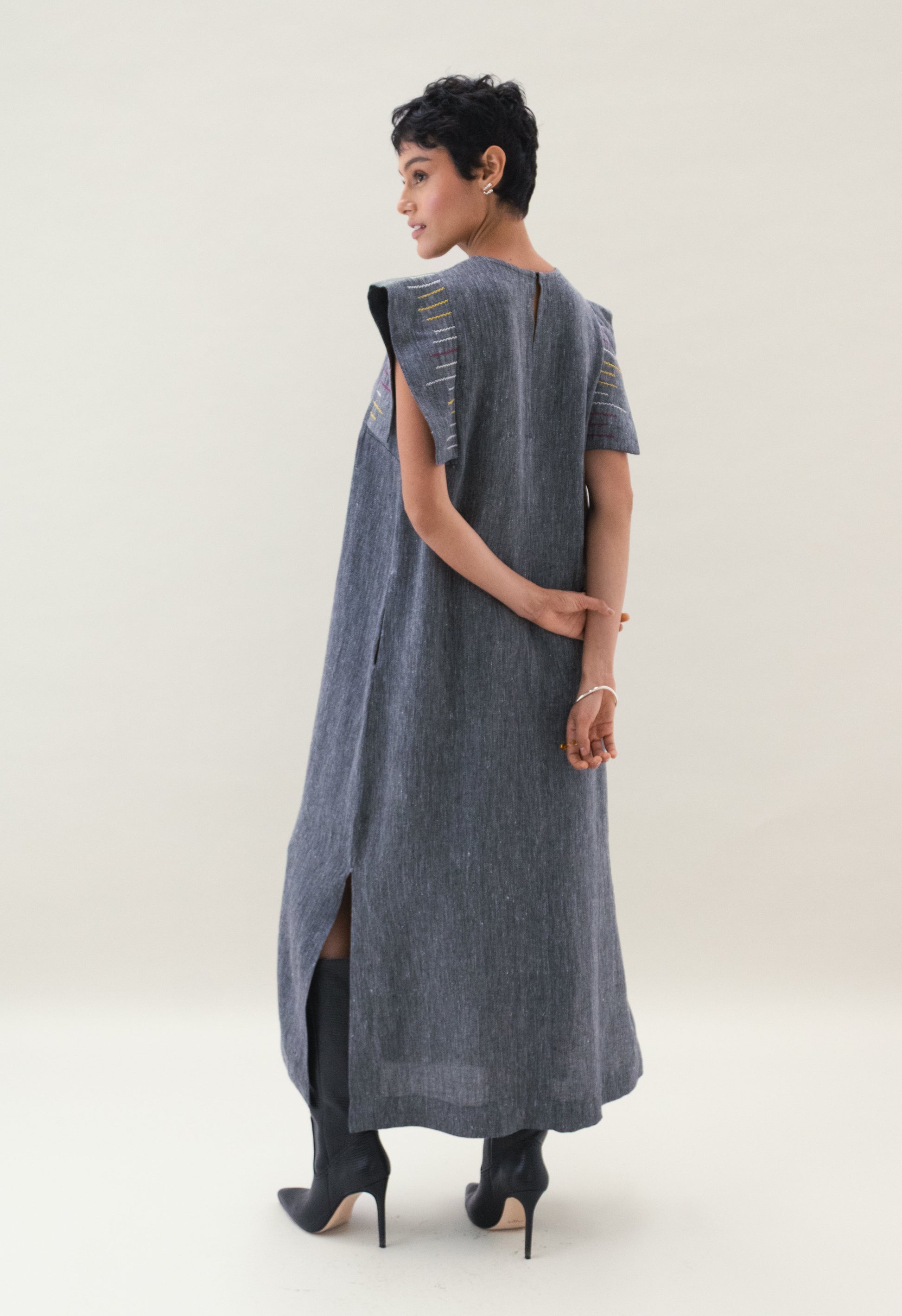 Vestido largo recto con silueta relajada, caja de cuello redonda, abertura en espalda y laterales, tiras montadas en hombros simulando mangas y bolsillos ocultos.